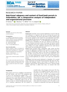 Background: Food bank use has increased significantly in the UK. With the rise in demand, it is imperative that users are receiving food parcels that meet their requirements. The present study aimed to explore whether typical food parcels, supplied by The Trussell Trust and independent food banks, were meeting the daily nutrient and energy requirements of an adult user. Methods: The Trussell Trust (n = 2) and independent food banks (n = 9) were surveyed in Oxfordshire, UK. Data were collected on food bank use, resources, donations and parcel content. The energy and nutrient contents of a representative parcel were compared with the average dietary reference values (DRVs) for an adult. Additional comparisons were made between The Trussell Trust and independent provision. Results: Parcels provided energy, carbohydrate, sugar, protein and fibre contents that significantly exceeded the DRVs. In total, 62.2% of energy was provided as carbohydrate and 569% of the DRV was provided by sugars. The vitamin D and retinol content of the parcels was significantly lower than the DRVs, meeting 25% and 27% of users’ needs respectively; provision of all other micronutrients exceeded the DRVs. The Trussell Trust’s parcels provided significantly less vitamin D and copper than independent parcels. Conclusions: Food bank parcels distributed in Oxfordshire, UK, exceeded energy requirements and provided disproportionately high sugar and carbohydrate and inadequate vitamin A and vitamin D compared to the UK guidelines. Improved links with distributors and access to cold food storage facilities would help to address these issues, via increased fresh food provision