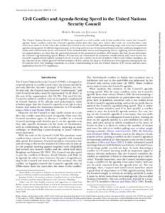 The UN Security Council (UNSC) can respond to a civil conflict only if that conflict first enters the Council’s agenda. Some conflicts reach the Council’s agenda within days after they start, others after years (or even decades), and some never make it. So far, only a few studies have looked at the crucial UNSC agenda-setting stage, and none have examined agenda-setting speed. To fill this important gap, we develop and test a novel theoretical framework that combines insights from realist and constructivist theory with lessons from institutionalist theory and bargaining theory. Applying survival analysis to an original dataset, we show that the parochial interests of the permanent (P-5) members matter, but they do not determine the Council’s agenda-setting speed. Rather, P-5 interests are constrained by normative considerations and concerns for the Council’s organizational mission arising from the severity of a conflict (in terms of spillover effects and civilian casualties); by the interests of the widely ignored elected members (E-10); and by the degree of preference heterogeneity both among the P-5 and the E-10. Our findings contribute to a better understanding of how the UN works, and they have implications for the UN’s legitimacy.