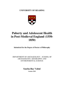Valme, S.-R. (2019) Puberty and adolescent health in post-medieval England (1550-1850). PhD thesis, University of Reading. doi: 10.48683/1926.00089368