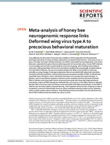 Traniello, I. M., Bukhari, S. A., Kevill, J., Ahmed, A. C., Hamilton, A. R., Naeger, N. L., Schroeder, D. C. and Robinson, G. E. (2020) Meta-analysis of honey bee neurogenomic response links deformed wing virus type A to precocious behavioral maturation. Scientific Reports, 10. 3101. ISSN 2045-2322 doi: 10.1038/s41598-020-59808-4