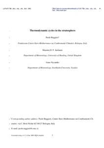 Ruggieri, P., Ambaum, M. ORCID: https://orcid.org/0000-0002-6824-8083 and Nycander, J. (2020) Thermodynamic cycles in the stratosphere. Journal of the Atmospheric Sciences, 77 (6). pp. 1897-1912. ISSN 1520-0469 doi: 10.1175/JAS-D-19-0188.1
