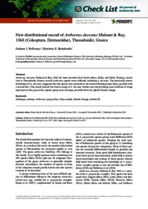 Holloway, G. J. ORCID: https://orcid.org/0000-0003-0495-0313 and Bakaloudis, D. E. (2019) New distributional record of Anthrenus dorsatus Mulsant & Rey, 1868 (Coleoptera, Dermestidae), Thessaloniki, Greece. Check List, 15 (6). pp. 1077-1081. ISSN 1809-127X doi: 10.15560/15.6.1077