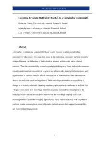 Approaches to enhancing sustainability have largely focused on altering individual consumption behaviors. However, this focus on the individual consumer has been recently critiqued because the behavior of individuals is situated within wider socio-cultural contexts. Thus, the sustainability research agenda is shifting away from individual consumers towards understanding consumption practices, social networks, material infrastructures and organisations of various forms in which consumption is problematized and consumption choices are reflected upon and negotiated. These social spaces need to be understood if change is to be truly achieved. Drawing on ethnographic research conducted in an Irish ecovillage, we examine how ecovillage members negotiate sustainable consumption at the everyday level. Analysis reveals how members of the ecovillage employ tactics that encourage reflexivity in the everyday. Specifically, these reflexive tactics work together to confront routine consumption, create alternative infrastructures that support sustainability, and foster critical engagement.