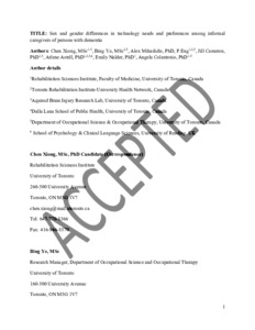 Xiong, C., Ye, B., Mihailidis, A., Cameron, J. I., Astell, A. ORCID: https://orcid.org/0000-0002-6822-9472, Nalder, E. and Colantonio, A. (2020) Sex and gender differences in technology needs and preferences among informal caregivers of persons with dementia. BMC Geriatrics, 20. 176. ISSN 1471-2318 doi: 10.1186/s12877-020-01548-1