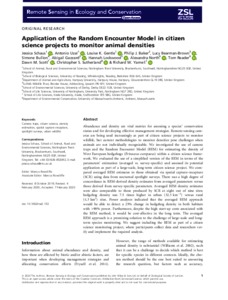 Schaus, J., Uzal, A., Gentle, L. K., Baker, P. J., Bearman-Brown, L., Bullion, S., Gazzard, A., Lockwood, H., North, A., Reader, T., Scott, D. M., Sutherland, C. S. and Yarnell, R. W. (2020) Application of the Random Encounter Model in citizen science projects to monitor animal densities. Remote Sensing in Ecology and Conservation, 6 (4). pp. 514-528. ISSN 2056-3485 doi: 10.1002/rse2.153