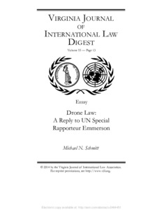 Schmitt, M. ORCID: https://orcid.org/0000-0002-7373-9557 (2014) Drone law: a reply to UN Special Rapporteur Emmerson. Virginia Journal of International Law Digest, 55 (13). pp. 13-28.