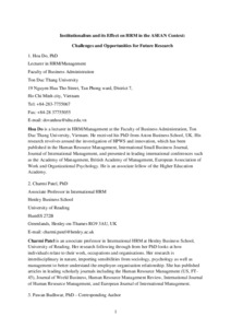 Do, H., Patel, C., Budhwar, P., Katou, A. A., Arora, B. and Dao, M. (2020) Institutionalism and its effect on HRM in the ASEAN context: challenges and opportunities for future research. Human Resource Management Review, 30 (4). 100729. ISSN 1053-4822 doi: 10.1016/j.hrmr.2019.100729