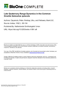 Capainolo, P., Perktaş, U. and Fellowes, M. D. E. ORCID: https://orcid.org/0000-0001-5431-8637 (2020) Late quaternary range dynamics in the common grackle Quiscalus quiscula. Ardea, 108 (1). pp. 95-104. ISSN 0373-2266 doi: 10.5253/arde.v108i1.a8