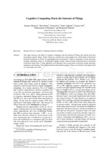 Abstract: This paper discusses the blend of cognitive computing with the Internet-of-Things that should result into developing cognitive things. Today’s things are confined into a data-supplier role, which deprives them from being the technology of choice for smart applications development. Cognitive computing is about reasoning, learning, explaining, acting, etc. In this paper, cognitive things’ features include functional and non-functional restrictions along with a 3 stage operation cycle that takes into account these restrictions during reasoning, adaptation, and learning. Some implementation details about cognitive things are included in this paper based on a water pipe case-study.