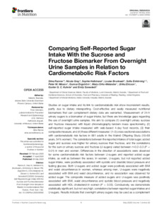 Studies on sugar intake and its link to cardiometabolic risk show inconsistent results, partly due to dietary misreporting. Cost-effective and easily measured nutritional biomarkers that can complement dietary data are warranted. Measurement of 24-hour urinary sugars is a biomarker of sugar intake, but there are knowledge gaps regarding the use of overnight urine samples. We aim to compare 1) overnight urinary sucrose and fructose measured with liquid chromatography-tandem mass19 spectrometry, 2) self-reported sugar intake measured with web-based 4-day food records, 3) their composite measure, and 4) these different measures’ (1-3) cross-sectional associations with cardiometabolic risk factors in 991 adults in the Malmö Offspring Study (18-69 years, 54% women). The correlations between the reported intakes of total sugar, added sugar and sucrose was higher for urinary sucrose than fructose, and the correlations for the sum or urinary sucrose and fructose (U24 sugars) varied between r≈0.2-0.3 (P<0.01) in men and women. Differences in the direction of associations were observed for some cardiometabolic risk factors between U-sugars and reported added sugar intake, as well as between the sexes. In women, U-sugars, but not reported added sugar intake, were positively associated with systolic and diastolic blood pressure and fasting glucose. Both U-sugars and added sugar were positively associated with BMI and waist circumference in women, whereas among men, U-sugars were negatively associated with BMI and waist circumference, and no association was observed for added sugar. The composite measure of added sugars and U-sugars was positively associated with BMI, waist circumference and systolic blood pressure and negatively associated with HDL cholesterol in women (P<0.05). Conclusively, we demonstrate statistically significant, but not very high, correlations between reported sugar intakes and U-sugars. Results indicate that overnight urinary sugars may be used as a complement to self-reported dietary data when investigating associations between sugar exposure and cardiometabolic risk. However, future studies are highly needed to validate the overnight urinary sugars as a biomarker because its use, instead of 24-hour urine, facilitates data collection.