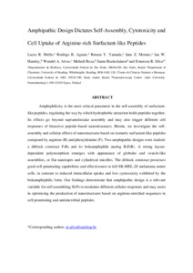Amphiphilicity is the most critical parameter in the self-assembly of surfactant-like peptides (SLPs), regulating the way by which hydrophobic attraction holds peptides together. Its effects go beyond supramolecular assembly and may also trigger different cell responses of bioactive peptide-based nanostructures. Herein, we investigate the self-assembly and cellular effects of nanostructures based on isomeric SLPs composed by arginine (R) and phenylalanine (F). Two amphipathic designs were studied: a diblock construct F4R4 and its bolaamphiphile analog R2F4R2. A strong sequence-dependent polymorphism emerges with appearance of globules and vesicle-like assemblies, or flat nanotapes and cylindrical micelles. The diblock construct possesses good cell penetrating capabilities and effectiveness to kill SK-MEL-28 melanoma tumor cells, in contrast to reduced intracellular uptake and low cytotoxicity exhibited by the bolaamphiphilic form. Our findings demonstrate that amphipathic design is a relevant variable for self-assembling SLPs to modulate different cellular responses and may assist in optimizing the production of nanostructures based on arginine-enriched sequences in cell penetrating and antimicrobial peptides.