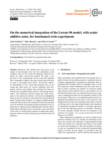 On the numerical integration of the Lorenz-96 model, with scalar additive noise, for benchmark twin experiments.