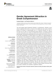 Paspali, A. and Marinis, T. (2020) Gender agreement attraction in Greek comprehension. Frontiers in Psychology, 11. 717. ISSN 1664-1078 doi: 10.3389/fpsyg.2020.00717