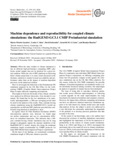Guarino, M.-V., Sime, L. C., Schroeder, D. ORCID: https://orcid.org/0000-0003-2351-4306, Lister, G. M. S. and Hatcher, R. (2020) Machine dependence and reproducibility for coupled climate simulations: the HadGEM3-GC3.1 CMIP Preindustrial simulation. Geoscientific Model Development, 13 (1). pp. 139-154. ISSN 1991-9603 doi: 10.5194/gmd-13-139-2020
