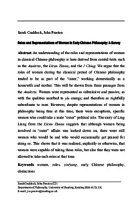 An understanding of the roles and representations of women in classical Chinese philosophy is here derived from central texts such as the Analects, the Lienu Zhuan, and the I Ching. We argue that the roles of women during the classical period of Chinese philosophy tended to be as part of the “inner,” working domestically as a housewife and mother. This will be shown from three passages from the Analects. Women were represented as submissive and passive, as with the qualities ascribed to yin energy, and therefore as rightfully subordinate to men. However, despite representations of women in philosophy being thus at this time, there were exceptions, specific women who could take a male “outer” political role. The story of Ling Liang from the Lienu Zhuan suggests that although women being involved in “outer” affairs was looked down on, there were still women who would be and who would occasionally get praised for doing so. This shows that it was realised, explicitly or otherwise, that women were capable of taking those roles, but also that they were not allowed to take such roles at that time.