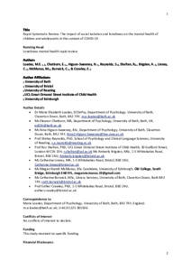 Loades, M. E., Chatburn, E., Higson-Sweeney, N., Reynolds, S., Shafran, R., Brigden, A., Linney, C., McManus, M. N., Borwick, C. and Crawley, E. (2020) Rapid systematic review: the impact of social isolation and loneliness on the mental health of children and adolescents in the context of COVID-19. Journal of the American Academy of Child and Adolescent Psychiatry, 59 (11). pp. 1218-1239. ISSN 0890-8567 doi: 10.1016/j.jaac.2020.05.009