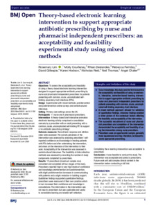 Lim, R. ORCID: https://orcid.org/0000-0003-1705-1480, Courtenay, M., Deslandes, R., Ferriday, R., Gillespie, D., Hodson, K., Reid, N., Thomas, N. and Chater, A. (2020) Theory-based electronic learning intervention to support appropriate antibiotic prescribing by nurse and pharmacist independent prescribers: an acceptability and feasibility experimental study using mixed methods. BMJ Open, 10 (6). e036181. ISSN 2044-6055 doi: 10.1136/bmjopen-2019-036181