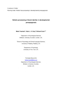 Tsantani, M., Gray, K. L. H. ORCID: https://orcid.org/0000-0002-6071-4588 and Cook, R. (2020) Holistic processing of facial identity in developmental prosopagnosia. Cortex, 130. pp. 318-326. ISSN 0010-9452 doi: 10.1016/j.cortex.2020.06.003