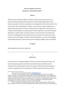 While we may be witnessing a highpoint of interest in the lives of early women lawyers, and women’s legal history generally, feminist legal history remains largely undeveloped in the UK. Drawing on examples of women’s representation in and engagement with law and law reform in the UK and Ireland, this article delineates the method, scope and purpose of feminist legal history. It begins by exploring the place of women in traditional accounts of legal history, before going on to consider the methodological and substantive goals of feminist legal history. We argue that feminist legal history is a political project, requiring its authors to commit not only to uncovering untold stories but to challenging and revising dominant historical narratives. We conclude with a call for scholars to take up the insights and methods of feminist legal history as a means of acknowledging and celebrating the agency of those involved in past and ongoing struggles for justice and equality.