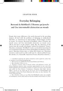 Drawing on metropolitan theories of le quotidien, this chapter investigates Robillard’s Franco-Mauritian protagonists’ thwarted quests to find a place of belonging within the shared, public spaces of Mauritius and of Paris. It then plots their ultimate reconciliation with the mundane, everyday place of ‘home’ by means of strategic ‘pratiques de l’espace’ (Certeau) and through writing. In their focus on the minutiae of everyday life, Robillard’s unjustly neglected novels confound critical expectations of the nature of ‘post-colonial’ literature. Nonetheless, I argue, his novels could also be seen to depict Mauritius as a place in which only white, male, middle-class individuals have the luxury of entertaining such purportedly ‘everyday’ forms of belonging.