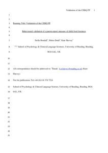 Food fussiness is the rejection of familiar and novel foods leading to consumption that is insufficient and/or inadequately varied. Its importance to children’s nutrition and the development of food preferences means it has been the focus of extensive research. To measure food fussiness, research has predominantly relied on parent-report, though parents’ reporting of their child’s eating behaviour can be reliable, responses may also be subject to bias. Utilising data from video-recordings of sixty-seven mother-child dyads during a meal in the home environment, this study aimed to validate the most widely used parent-report questionnaire measuring food fussiness against independent observations of children’s eating behaviour and, in so doing, determine its accuracy. Maternal reported food fussiness, assessed using the Food Fussiness subscale of the Children’s Eating Behaviour Questionnaire (CEBQ; Wardle, Guthrie, Sanderson, & Rapoport, 2001) was compared to children’s observed food rejection and acceptance behaviours. Bootstrapped Pearson’s correlations revealed that maternal reports of food fussiness were significantly positively related to food rejection behaviours and significantly negatively related to food acceptance behaviours. Maternal reports of food fussiness were also found to be significantly negatively related to the proportion of familiar/appealing of familiar foods consumed by the child. There was no significant association between maternal reported food fussiness and the proportion of familiar/unappealing, unfamiliar/appealing and unfamiliar/unappealing foods consumed by the child or the meal duration. These findings support the CEBQ FF as a valid measure of food fussiness.