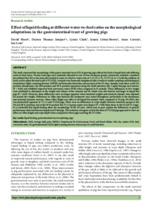 The study examined the morphology of the gastro-intestinal tract (GI) of growing pigs offered dry feed or liquid feed with differing water-to-feed ratios. Twenty male pigs were randomly allocated to one of four treatment groups; treatments included a standard dry pelleted diet (D) or the same diet soaked in water at a feed-to-water ratio of 1:1.5 (T1:1.5), 1:3 (T1:3) or 1:3 with the addition of lactic acid to adjust the feed to pH 4 (T1:3[4]). Animals were humanely slaughtered after 6 weeks to enable sampling and histological examination (light, scanning electron (LSEM) and binocular dissection microscope) of the GI tract. Samples were taken at the 2% position (duodenum), the 20% position and 50 % position (jejunum) along the small intestines (SI). Liquid-fed pigs were heavier (P < 0.05) and exhibited improved feed conversion ratios (FCR) when compared to D animals. These differences in live weight were attributed to alterations in the weight and volume of the stomach and SI, which were also heavier and larger in liquid-fed pigs (P < 0.05). However, these differences were no longer apparent when intestinal weights and stomach volumes were adjusted for animal live weight. Differences in villus type between the treatments were noted throughout, particularly in the duodenum and proximal jejunum sections. Mean villus height was taller in all liquid-fed animals when compared to D pigs (P<0.05); this was particularly apparent in T1:1.5 and T1:3[4] pigs. There were no differences in crypt depths between treatment groups at the 2% and 20 % positions, but at the 50 % position the T1:1.5 group crypts were deeper (P < 0.05) than those in the D and T1:3 pigs. It is concluded that liquid feeding alters the morphology of the GI tract, which may in part, explain the differences in growth performance observed between liquid and D fed pigs. The inclusion of organic acid in the diets of T1:3[4] pigs appeared to exert an effect on villus height and crypt depth when compared to those pigs receiving the T1:3 diet.