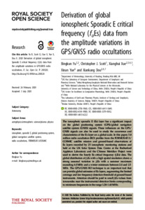 Yu, B., Scott, C. ORCID: https://orcid.org/0000-0001-6411-5649, Xue, X., Yue, X. and Dou, X. (2020) Derivation of global ionospheric sporadic E critical frequency (foEs) data from the amplitude variations in GPS/GNSS radio occultations. Royal Society Open Science, 7 (7). 200320. ISSN 2054-5703 doi: 10.1098/rsos.200320