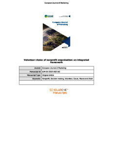 Mitchell, S.-L. and Clark, M. ORCID: https://orcid.org/0000-0002-7123-4248 (2021) Volunteer choice of nonprofit organisation: an integrated framework. European Journal of Marketing, 55 (1). pp. 63-94. ISSN 0309-0566 doi: 10.1108/EJM-05-2019-0427