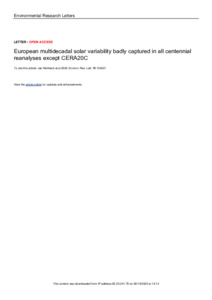 Wohland, J., Brayshaw, D. J. ORCID: https://orcid.org/0000-0002-3927-4362, Bloomfield, H. ORCID: https://orcid.org/0000-0002-5616-1503 and Wild, M. (2020) European multidecadal solar variability badly captured in all centennial reanalyses except CERA20C. Environmental Research Letters, 15 (10). ISSN 1748-9326 doi: 10.1088/1748-9326/aba7e6