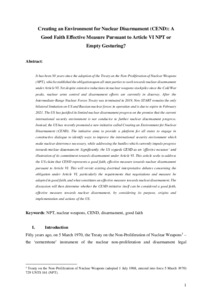 It has been 50 years since the adoption of the Treaty on the Non-Proliferation of Nuclear Weapons (NPT), which established the obligation upon all state parties to work towards nuclear disarmament under Article VI. Yet despite extensive reductions in nuclear weapons stockpiles since the Cold War peaks, nuclear arms control and disarmament efforts are currently in disarray. After the Intermediate-Range Nuclear Forces Treaty was terminated in 2019, New START remains the only bilateral limitation on US and Russian nuclear forces in operation and is due to expire in February 2021. The US has justified its limited nuclear disarmament progress on the premise that the current international security environment is not conducive to further nuclear disarmament progress. Instead, the US has recently promoted a new initiative called Creating an Environment for Nuclear Disarmament (CEND). The initiative aims to provide a platform for all states to engage in constructive dialogue to identify ways to improve the international security environment which make nuclear deterrence necessary, while addressing the hurdles which currently impede progress towards nuclear disarmament. Significantly, the US regards CEND as an ‘effective measure’ and illustration of its commitment towards disarmament under Article VI. This article seeks to address the US claim that CEND represents a good faith, effective measure towards nuclear disarmament pursuant to Article VI. This will revisit existing doctrinal interpretative debates concerning the obligation under Article VI, particularly the requirements that negotiations and measure be adopted in good faith, and what constitutes an effective measure towards nuclear disarmament. The discussion will then determine whether the CEND initiative itself can be considered a good faith, effective measure towards nuclear disarmament, by considering its purpose, origins and implementation and actions of the US.