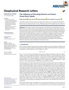 The climate's response to forcing depends on how efficiently heat is absorbed by the ocean. Much, if not most, of this ocean heat uptake results from the passive transport of warm surface waters into the ocean's interior. Here we examine how geographic patterns of surface warming influence the efficiency of this passive heat uptake process. We show that the average pattern of surface warming in CMIP5 damps passive ocean heat uptake efficiency by nearly 25%, as compared to homogeneous surface warming. This “pattern effect” occurs because strong ventilation and weak surface warming are robustly colocated, particularly in the Southern Ocean. However, variations in warming patterns across CMIP5 do not drive significant ensemble spread in passive ocean heat uptake efficiency. This spread is likely linked to intermodel differences in ocean circulation, which our idealized results suggest may be dominated by differences in Southern Ocean and subtropical ventilation processes.
