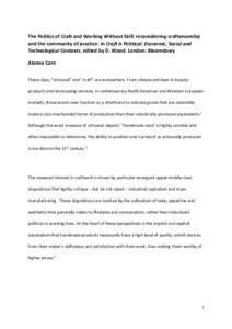 Clare Wilkinson Weber and Alicia Ory DeNicola, ‘Introduction: Taking stock of craft in anthropology,’ in Critical Craft: Technology, Globalization and Capitalism, eds. Clare Wilkinson-Weber and Alicia Ory DeNicola. (London: Bloomsbury, 2016), 1-16.