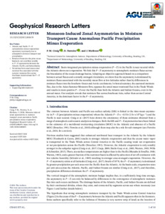Monsoon‐induced zonal asymmetries in moisture transport cause anomalous Pacific precipitation minus evaporation