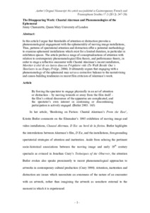 In this article I argue that thresholds of attention or distraction provoke a phenomenological engagement with the ephemerality of moving image installations. Thus, patterns of spectatorial attention and distraction offer a potential methodology to examine ephemeral installations which exist for a limited duration, in particular in exhibition spaces. The article probes a range of conceptualizations of attention with relation to contemporary phenomenological film theory, and performance theory, in order to stage a reflective encounter with Chantal Akerman’s recent installation, Marcher à côté de ses lacets dans un frigidaire vide (To Walk Beside One’s Shoelaces in an Empty Fridge, 2004). It ultimately argues that engaging with a phenomenology of the ephemeral may act as a corrective balance to the narrativizing and canon-building tendencies in recent film criticism of Akerman’s work.