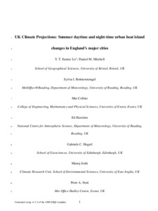 Eunice Lo, Y. T., Mitchell, D. M., Bohnenstengel, S. I., Collins, M., Hawkins, E. ORCID: https://orcid.org/0000-0001-9477-3677, Hegerl, G. C., Joshi, M. and Stott, P. A. (2020) U.K. climate projections: Summer daytime and nighttime urban heat island changes in England’s major cities. Journal of Climate, 33 (20). pp. 9015-9030. ISSN 0894-8755 doi: 10.1175/JCLI-D-19-0961.1