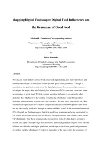 Drawing on recent debates around food, space and digital media, this paper introduces and develops the concepts of the digital foodscape and ‘good’ food grammars. Through a quantitative and qualitative analysis of the digital platforms, discourses and personas, we investigate the ways a key set of digital food influencers (DFIs) construct, curate and share the meanings of good food. We first explore who these influencers are, describe what platforms they inhabit, how the variable social media affordances work through these platforms and the notions of good food they construct. We then focus specifically on DFIs’ communicative practices on Twitter to analyse the core discourses DFIs produce and those that are taken up by audiences through re-tweets and likes as well as the re-tweeted tweets of DFIs. Overall, our findings suggest that first, good food grammars are being constructed by rule setters beyond the already well-established food personalities and celebrity chefs of the UK’s foodscape. Yet, these grammars also re-inscribe a form of white, hetero-normative middle- and upper- class privilege that produces particular grammars of good food. Second, different social media and digital platforms provide space for diverse good food grammars given their variable affordances. Twitter, in particular, is the place where the grammars of DFIs take on non-food themes such as self-empowerment, inspiration, charity campaigning and awareness raising. Third, the notions of good food in DFI grammars revolve around a range of constructions, with the most elevated related to ‘clean’ eating and/or ‘clean’ lifestyles that combined healthy, ‘free from’ diets with fitness regimes and expand DFI grammars - and ultimately their brands – into a more holistic lifestyle brand. This paper’s initial empirical and conceptual foray into digital foodscapes and DFIs opens up space for further research on food and digital media within Geography and bey