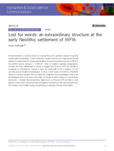 Mithen, S. ORCID: https://orcid.org/0000-0002-3391-7443 (2020) Lost for words: an extraordinary structure at the early Neolithic settlement of WF16. Humanities and Social Science Communications, 7 (1). 125. ISSN 2662-9992 doi: 10.1057/s41599-020-00615-7