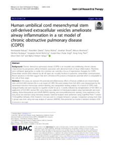 Background Chronic obstructive pulmonary disease (COPD) is an incurable and debilitating chronic disease characterized by progressive airflow limitation associated with abnormal levels of tissue inflammation. Therefore, stem cell-based approaches to tackle the condition are currently a focus of regenerative therapies for COPD. Extracellular vesicles (EVs) released by all cell types are crucially involved in paracrine, extracellular communication. Recent advances in the field suggest that stem cell-derived EVs possess a therapeutic potential which is comparable to the cells of their origin. Methods In this study, we assessed the potential anti-inflammatory effects of human umbilical cord mesenchymal stem cell (hUC-MSC)-derived EVs in a rat model of COPD. EVs were isolated from hUC-MSCs and characterized by the transmission electron microscope, western blotting, and nanoparticle tracking analysis. As a model of COPD, male Sprague-Dawley rats were exposed to cigarette smoke for up to 12 weeks, followed by transplantation of hUC-MSCs or application of hUC-MSC-derived EVs. Lung tissue was subjected to histological analysis using haematoxylin and eosin staining, Alcian blue-periodic acid-Schiff (AB-PAS) staining, and immunofluorescence staining. Gene expression in the lung tissue was assessed using microarray analysis. Statistical analyses were performed using GraphPad Prism 7 version 7.0 (GraphPad Software, USA). Student’s t test was used to compare between 2 groups. Comparison among more than 2 groups was done using one-way analysis of variance (ANOVA). Data presented as median ± standard deviation (SD). Results Both transplantation of hUC-MSCs and application of EVs resulted in a reduction of peribronchial and perivascular inflammation, alveolar septal thickening associated with mononuclear inflammation, and a decreased number of goblet cells. Moreover, hUC-MSCs and EVs ameliorated the loss of alveolar septa in the emphysematous lung of COPD rats and reduced the levels of NF-κB subunit p65 in the tissue. Subsequent microarray analysis revealed that both hUC-MSCs and EVs significantly regulate multiple pathways known to be associated with COPD. Conclusions In conclusion, we show that hUC-MSC-derived EVs effectively ameliorate by COPD-induced inflammation. Thus, EVs could serve as a new cell-free-based therapy for the treatment of COPD.