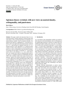 Tailleux, R. ORCID: https://orcid.org/0000-0001-8998-9107 (2021) Spiciness theory revisited, with new views on neutral density, orthogonality and passiveness. Ocean Science, 17 (1). pp. 203-219. ISSN 1812-0784 doi: 10.5194/os-17-203-2021
