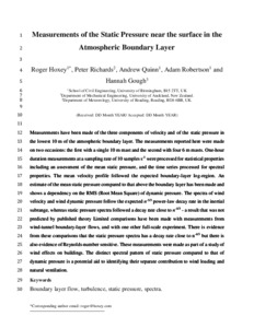 Hoxey, R., Richards, P., Quinn, A., Robertson, A. and Gough, H. (2021) Measurements of the static pressure near the surface in the atmospheric boundary layer. Journal of Wind Engineering and Industrial Aerodynamics, 209. 104487. ISSN 0167-6105 doi: 10.1016/j.jweia.2020.104487