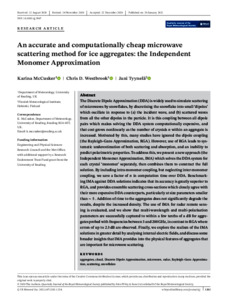 McCusker, K. ORCID: https://orcid.org/0000-0002-1886-5323, Westbrook, C. D. ORCID: https://orcid.org/0000-0002-2889-8815 and Tyynelä, J. (2021) An accurate and computationally cheap microwave scattering method for ice aggregates: the Independent Monomer Approximation. Quarterly Journal of the Royal Meteorological Society, 147 (735). pp. 1202-1224. ISSN 1477-870X doi: 10.1002/qj.3967