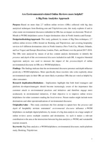 Purpose–Based on more than 2.7 million online reviews (ORs) collected with big data analytical techniques from Booking.com and TripAdvisor.com, this study explores if and to what extent environmental discourse embedded in ORs has an impact on electronic Word-of-Mouth (e-WOM) helpfulness across 8 major destination cities in North America and Europe. Design/methodology/approach–This study gathered, by means of Big Data techniques, 2.7 million online reviews (ORs) hosted on Booking and TripAdvisor, and covering hospitality services in 8 different destinations cities in North America (New York City, Miami, Orlando, and Las Vegas) and Europe (Barcelona, London, Paris, and Rome) over the period 2017-2018. The ORs were analysed by means of ad hoc content analytic dictionaries to identify the presence and depth of the environmental discourse included in each OR. A negative binomial regression analysis was used to measure the impact of the presence/depth of online environmental discourse in ORs on e-WOM helpfulness. Findings–The findings indicate that the environmental discourse presence and depth influence positively e-WOM helpfulness. More specifically those travelers who write explicitly about environmental topics in their ORs are more likely to produce ORs that are voted as helpful by other consumers. Research implications/limitations – Implications highlight that both hotel managers and platform developers/managers should become increasingly aware of the importance that customer attach to environmental practices and initiatives and therefore engage more assiduously in environmental initiatives, if their objective is to improve online review helpfulness for other customers reading the focal reviews. Future studies might include more destinations and other operationalizations of environmental discourse. Originality/value – This study constitutes the first attempt to capture how the presence and depth of hospitality services consumers’ environmental discourse influence e-WOM helpfulness on multiple digital platforms, by means of a big data analysis on a large sample of online reviews across multiple countries and destinations. As such it makes a relevant contribution to the area at the intersection between big data analytics, e-WOM, and sustainable tourism research.