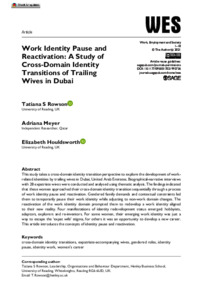 This study takes a cross-domain identity transition perspective to explore the development of work-related identities by trailing wives in Dubai, United Arab Emirates. Biographical-narrative interviews with 28 expatriate wives were conducted and analysed using thematic analysis. The findings indicated that these women approached their cross-domain identity transition sequentially through a process of work identity pause and reactivation. Gendered family demands and contextual constraints lead them to temporarily pause their work identity while adjusting to non-work domain changes. The reactivation of the work identity domain prompted them to redevelop a work identity aligned to their new reality. Four manifestations of identity redevelopment status emerged: hobbyists, adaptors, explorers and re-inventors. For some women, their emerging work identity was just a way to escape the ‘expat wife’ stigma, for others it was an opportunity to develop a new career. This article introduces the concepts of identity pause and reactivation.