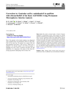 Purpose: Planned interim analysis of GENESIS; a prospective pilot study investigating the role of genicular artery embolization (GAE) in patients with mild to moderate osteoarthritis of the knee using permanent microspheres. Methods: Thirty-eight patients, median age = 60 (45–83), attended for GAE using 100–300 lm permanent microspheres. All patients had mild to moderate knee OA, resistant to conservative treatments over 6 months. Knee MRI was performed at baseline, and 12 months, enabling semi-quantitative analysis using Whole-Organ Magnetic Resonance Imaging Score (WORMS). Knee Injury and Osteoarthritis Outcome Score (KOOS) and visual analogue scale (VAS) (0–100 mm) were completed at baseline, 6 weeks, 3 months (n = 32), and 1-year (n = 16). Adverse events were recorded prospectively. Results: Technical success of accessing and embolizing the target genicular arteries was 84%. Six patients were not embolized: four due to a presumed risk of non-target embolization, and two due to a lack of hyperaemic target. Mean VAS improved from 60 (SD = 20, 95% CI 53–66) at baseline to 36 (SD = 24, 95% CI 28–44) at 3 months (p\0.001) and 45 (SD = 30, 95% CI 30–60) at 1-year (p\0.05). All KOOS subscales showed a significant improvement at 6-weeks, 3-months, and 1-year follow-up, except function in daily living, which reached borderline significance (p = 0.06) at 1-year. Four patients experienced mild self-limiting skin discoloration over the embolized territory. One patient experienced a small self-limiting groin haematoma. WORMS scores at 1-year follow-up showed significant improvement in synovitis (p \0.05). There were no cases of osteonecrosis. Conclusion: GAE using permanent microspheres in patients with mild to moderate knee OA is safe, with potential efficacy at early follow-up.