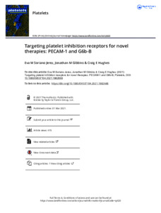 Soriano Jerez, E. M., Gibbins, J. M. ORCID: https://orcid.org/0000-0002-0372-5352 and Hughes, C. E. ORCID: https://orcid.org/0000-0002-9790-5820 (2021) Targeting platelet inhibition receptors for novel therapies: PECAM-1 and G6b-B. Platelets, 32 (6). pp. 761-769. ISSN 0953-7104 doi: 10.1080/09537104.2021.1882668