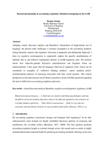 Adopting critical discourse analysis and Bourdieu’s theorization of dispositional use of language, the present study challenges a common assumption in the accounting standard setting literature, namely, that regulators’ discourse is purposely and deliberately deployed. I draw on cognitive sociolinguistics to empirically explore the specific manifestations of habitual, that is, pre-reflexive legitimation rhetoric in IASB regulatory texts. My analysis shows how taken-for-granted discursive rationalizations and linguistic forms are operationalized. I then argue that the language observed in regulatory texts, which can be considered as examples of ‘collective thinking artefacts’, enacts standard setters’ institutionalized patterns of reasoning associated with their social position. This critical perspective on the subconscious use of rhetoric generates a series of further questions regarding the lack of reflexivity in accounting regulatory processes.