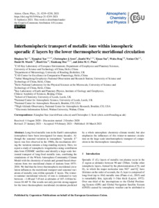 Interhemispheric transport of metallic ions within ionospheric sporadic E layers by the lower thermospheric meridional circulation.