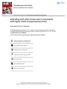 Adams, G. ORCID: https://orcid.org/0000-0003-2849-6303 and Salomons, T. V. (2021) Attending work with chronic pain is associated with higher levels of psychosocial stress. Canadian Journal of Pain, 5 (1). pp. 107-116. ISSN 2474-0527 doi: 10.1080/24740527.2021.1889925
