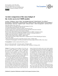 Keen, A., Blockley, E., Bailey, D. A., Debernard, J. B., Bushuk, M., Delhaye, S., Docquier, D., Feltham, D. ORCID: https://orcid.org/0000-0003-2289-014X, Massonet, F., O'Farrell, S., Ponsoni, L., Rodriguez, J. M., Schroeder, D. ORCID: https://orcid.org/0000-0003-2351-4306, Swart, N., Toyoda, T., Tsujino, H., Vancoppenolle, M. and Wyser, K. (2021) An inter-comparison of the mass budget of the Arctic sea ice in CMIP6 models. The Cryosphere, 15 (2). pp. 951-982. ISSN 1994-0424 doi: 10.5194/tc-15-951-2021