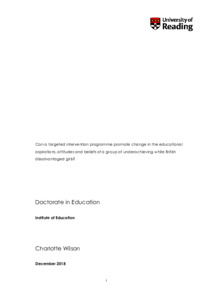 Wilson, C. (2020) Can a targeted intervention programme promote change in the educational aspirations, attitudes and beliefs of a group of underachieving white British disadvantaged girls? EdD thesis, University of Reading. doi: 10.48683/1926.00096801